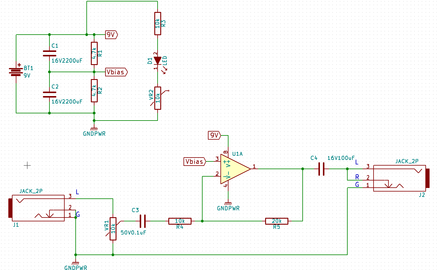 NJM5532が低雑音アンプっぽいからそれで作ってみたら、 ドライブ能力が低いらしく、増幅比が低いです。(2倍) あとこのアンプを通すと低音が出てないような気がします。 とりあえず手元のイヤホンでは聞けるから良しとします。 簡易のギターアンプはLM386Nを使ったものがあるみたいです。 THE386アンプ 必要になったら再挑戦しましょう。 以下回路図と外観です。 PR |